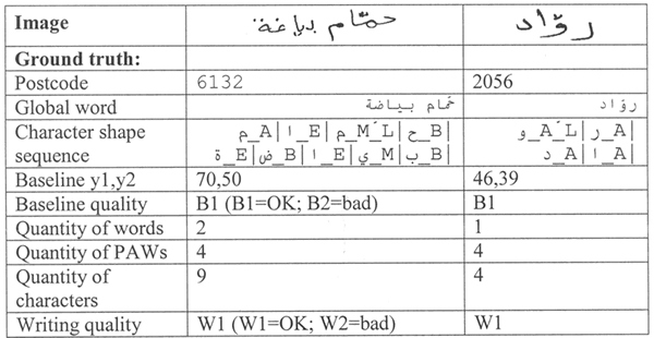 The table gives two examples of data set entries of the IFN/ENIT-database.